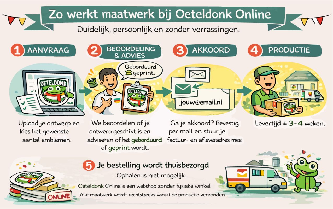 Omdat Oeteldonk Online een webshop zonder fysieke winkel is, wordt al het maatwerk rechtstreeks vanuit de productie verzonden. Ophalen is daarom niet mogelijk, maar zo houden we het proces efficiënt en de kwaliteit hoog.
